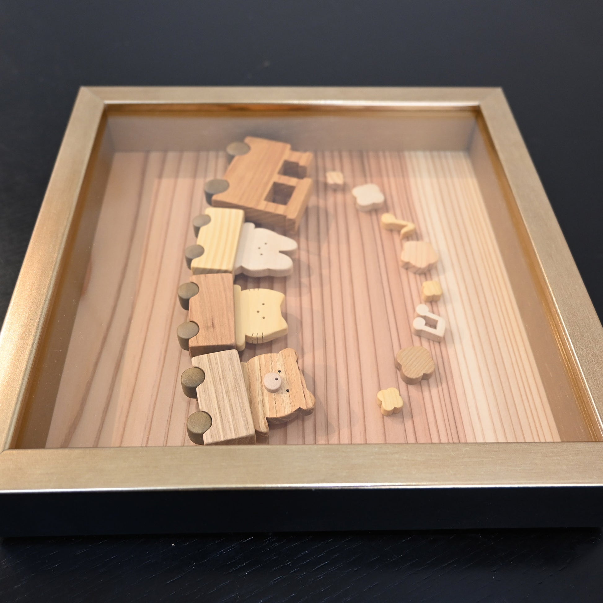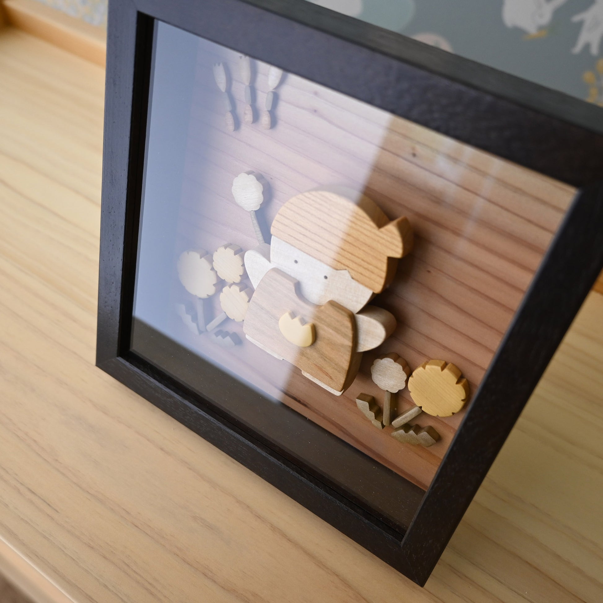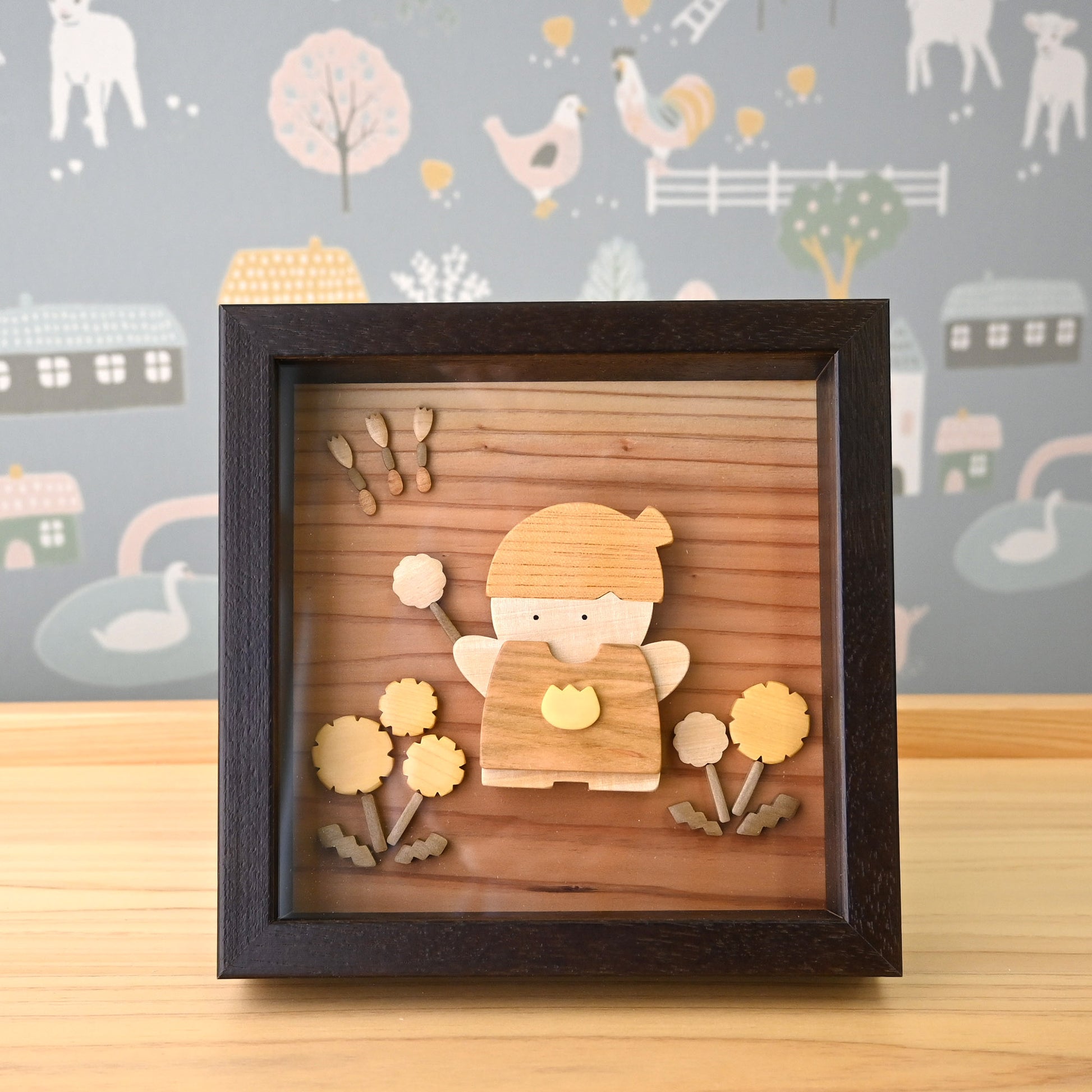 絵は木のボックス額に立体的に収められており、まるで小さな「木の箱庭」のよう。