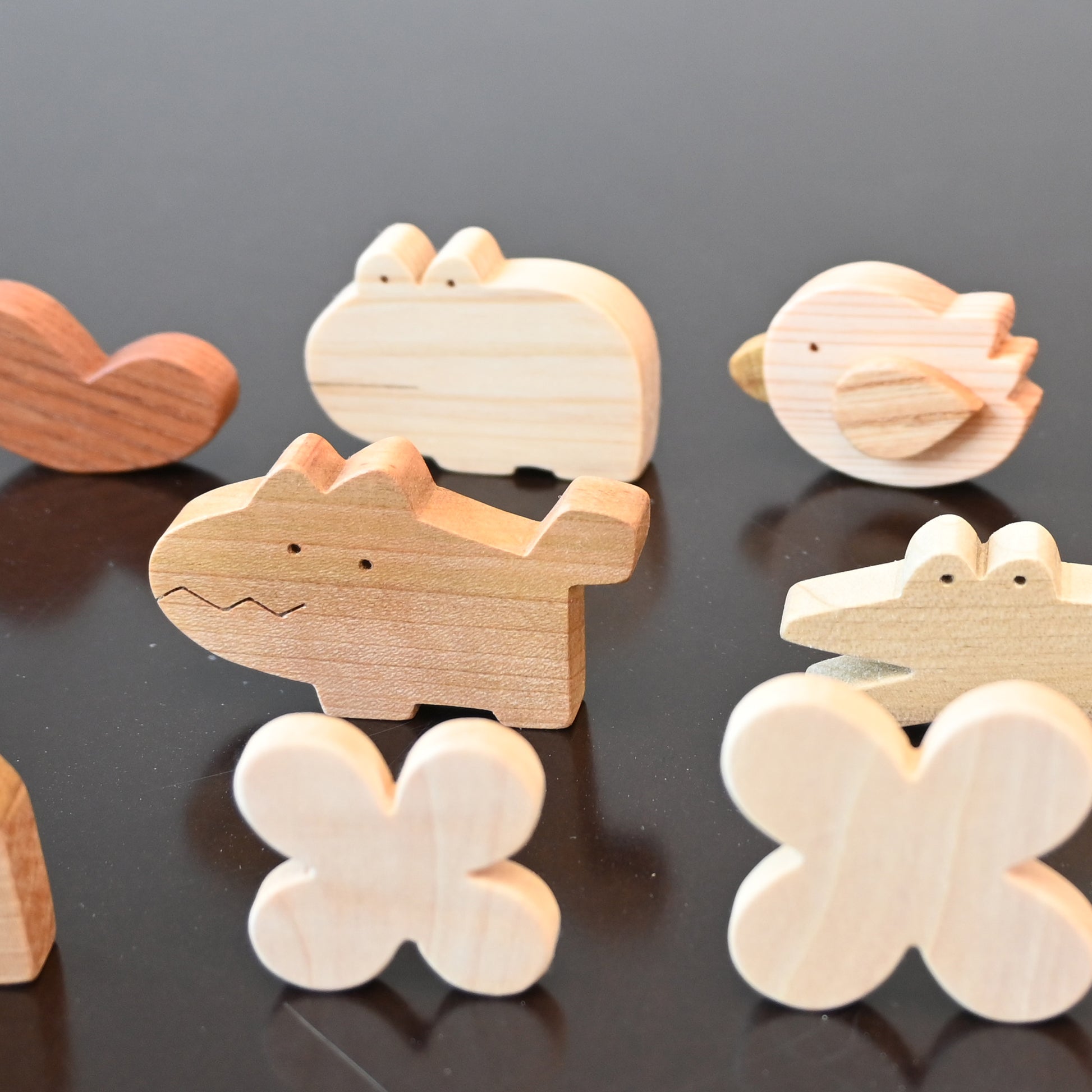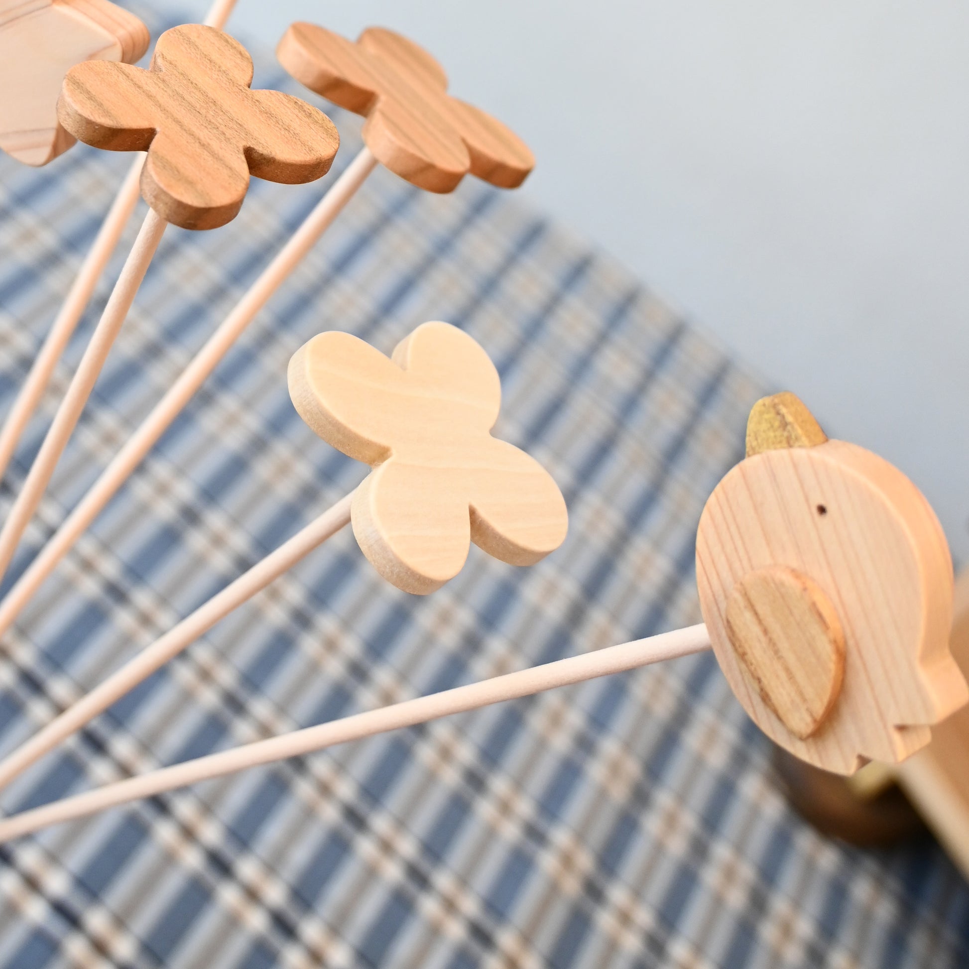 こんにちは、皆さん!今日は、私たちが製作しているとても可愛い木のお花をご紹介します。広葉樹のケヤキ、ほうのき、とちの木、かやのき、くりのき、ヒノキ、杉などを使って、色とりどりのお花を作ってみました。
