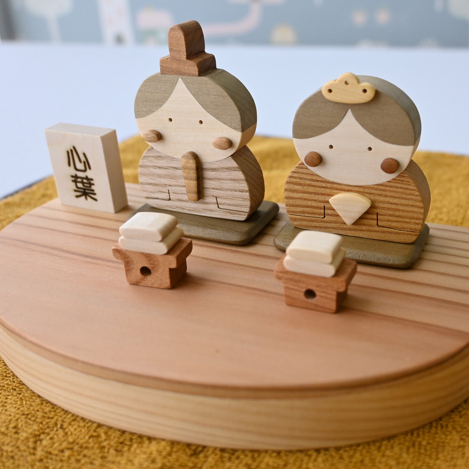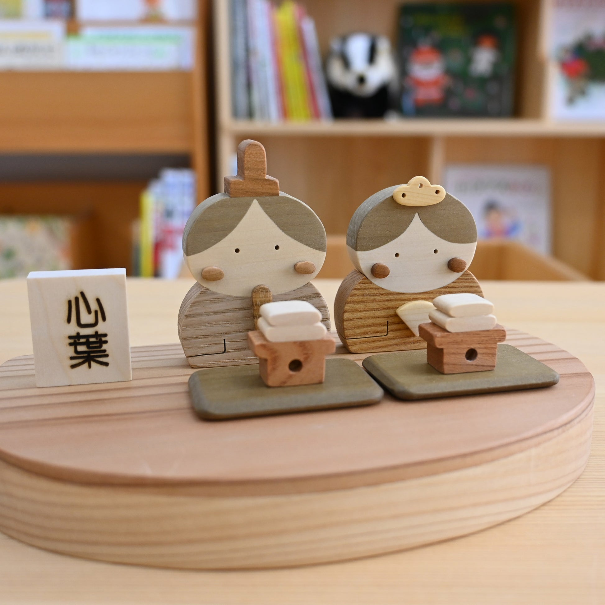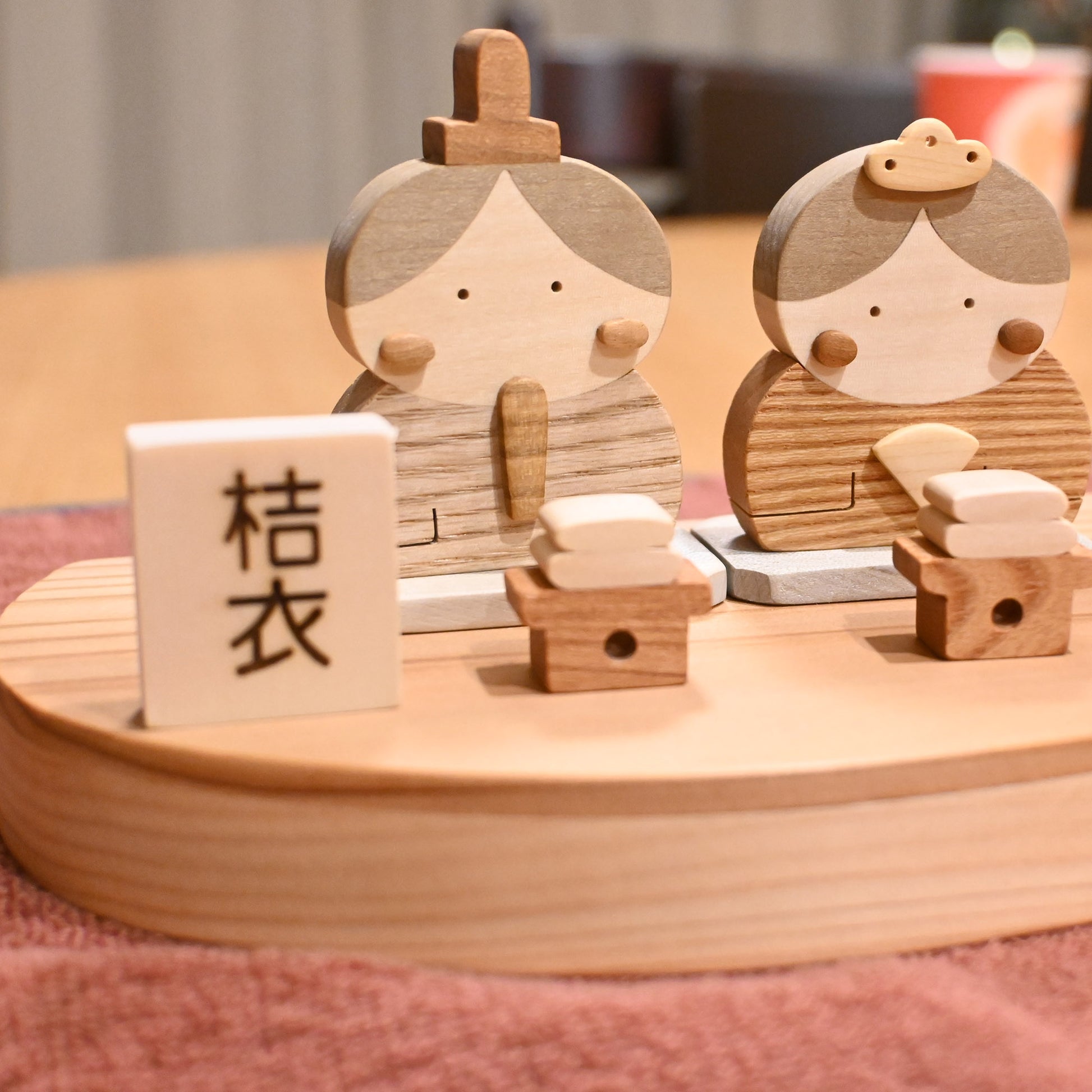 箱から出して並べてみましょう。名入れされた名札とおもちを並べると、木のかわいい雛人形の完成です。