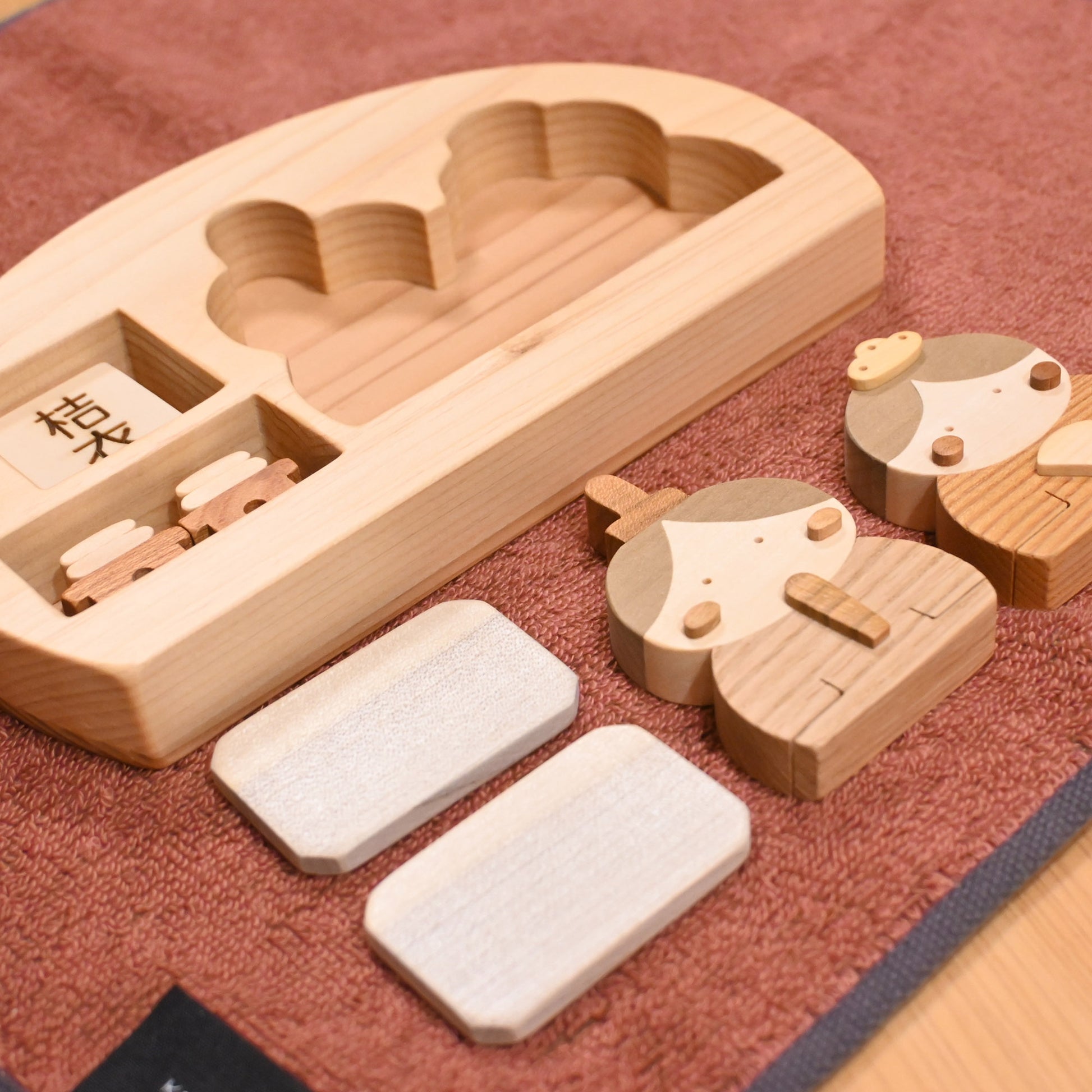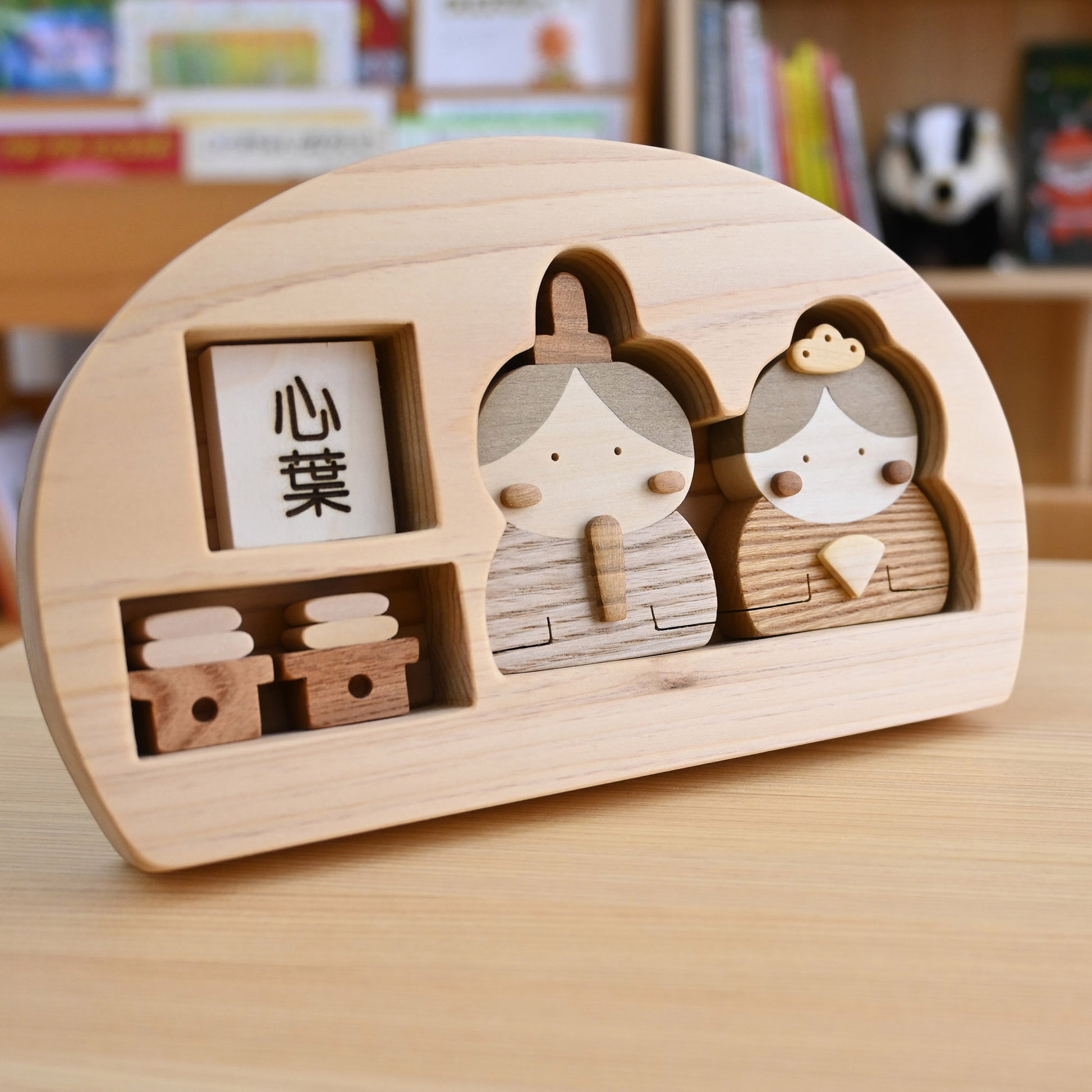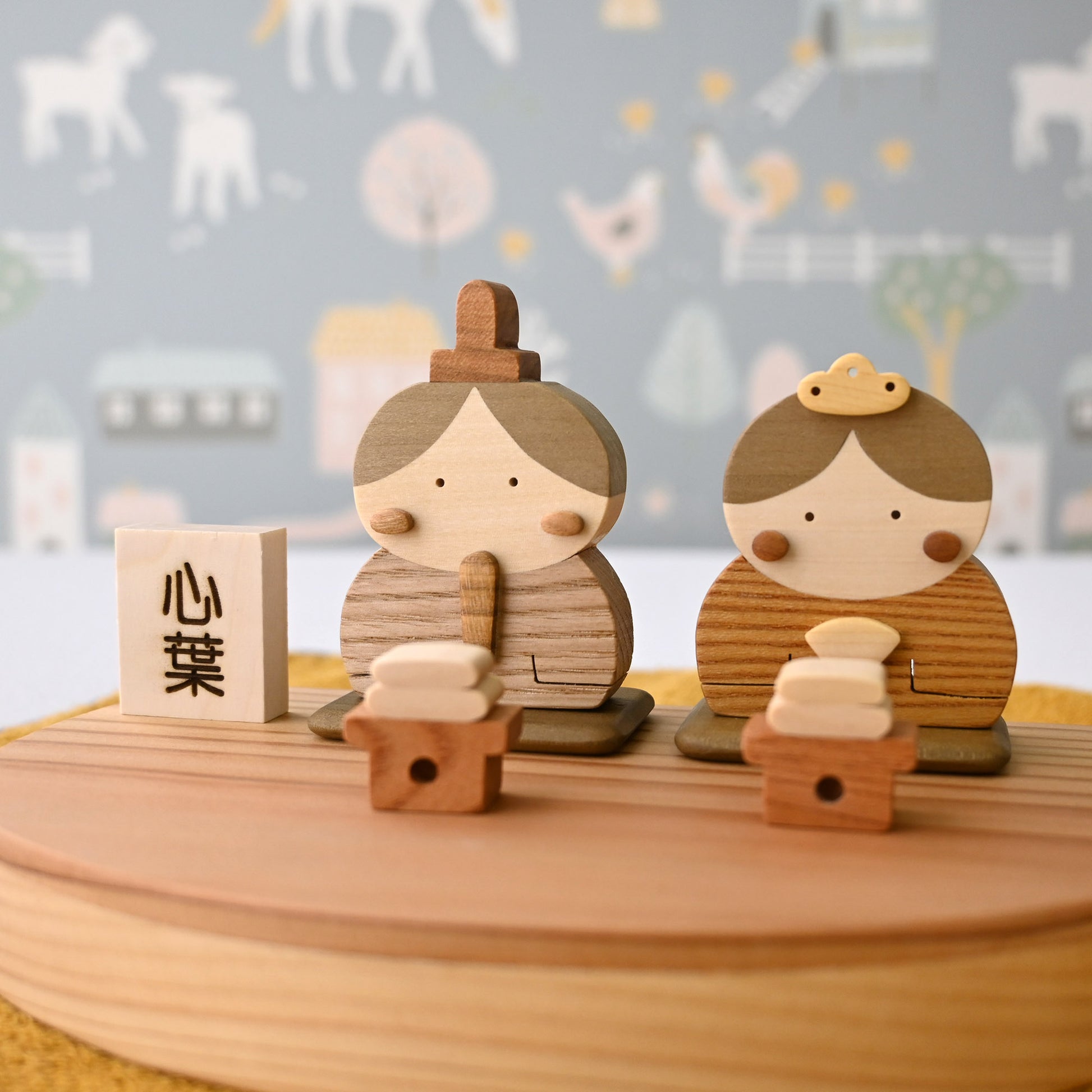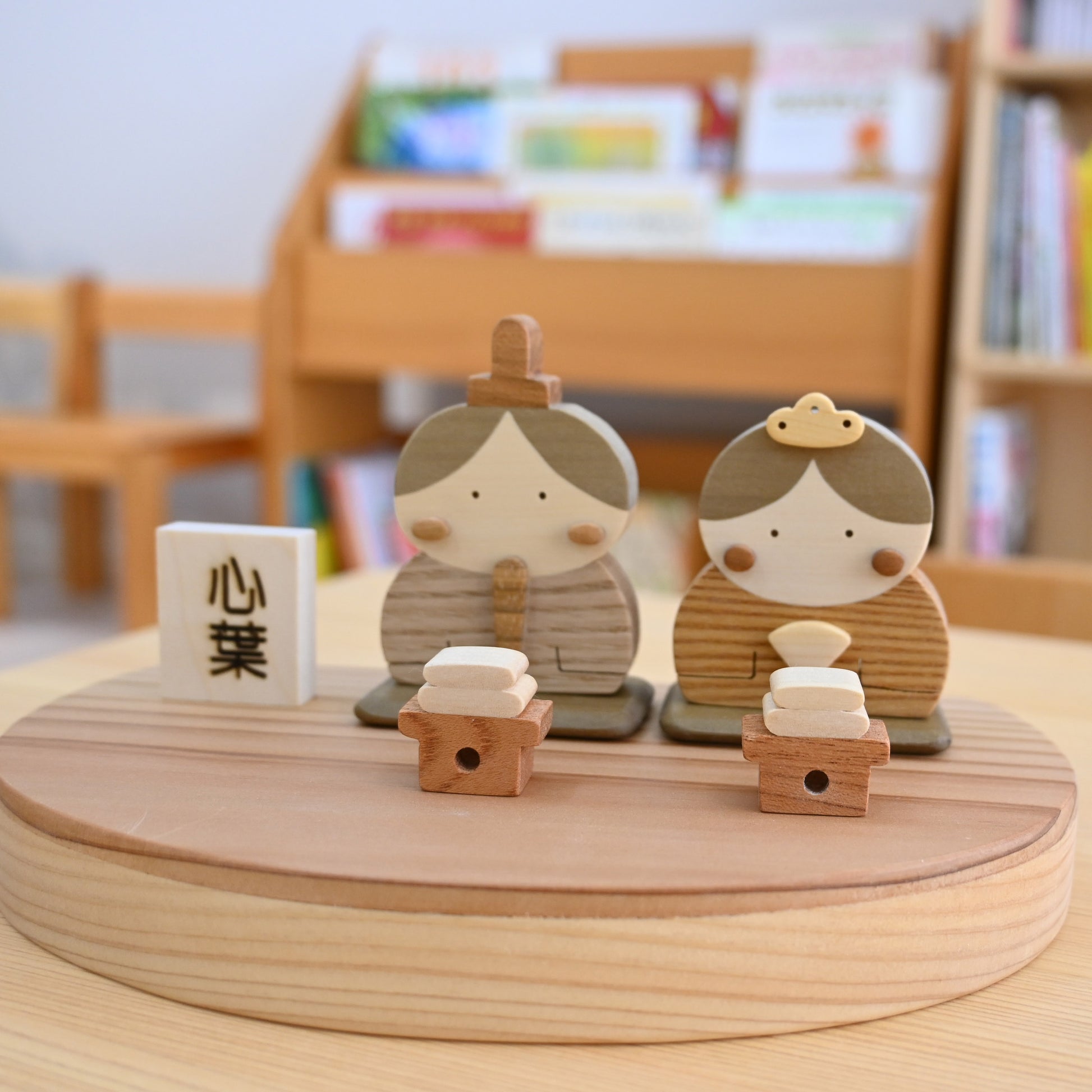 箱から出して並べてみましょう。名入れされた名札とおもちを並べると、木のかわいい雛人形の完成です。