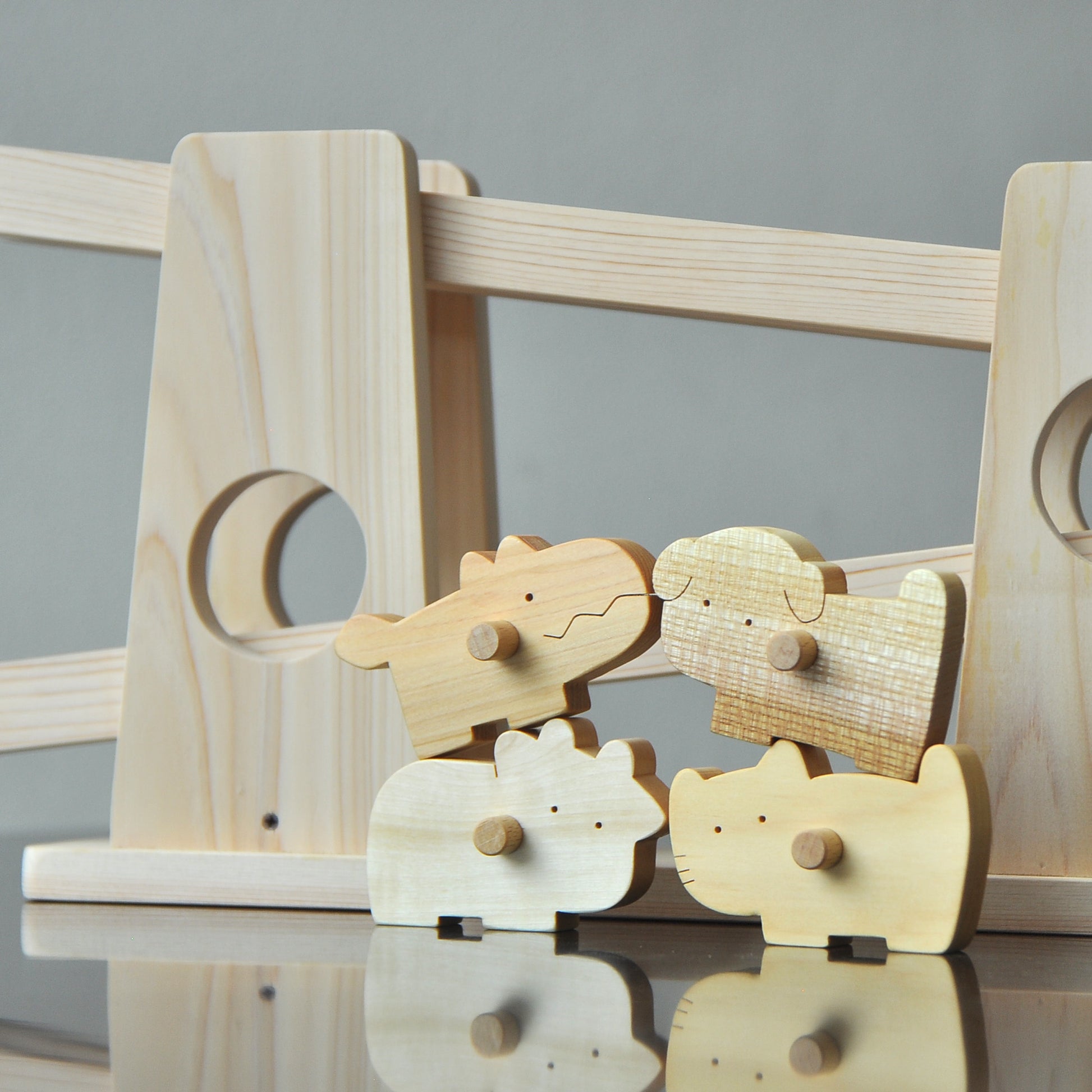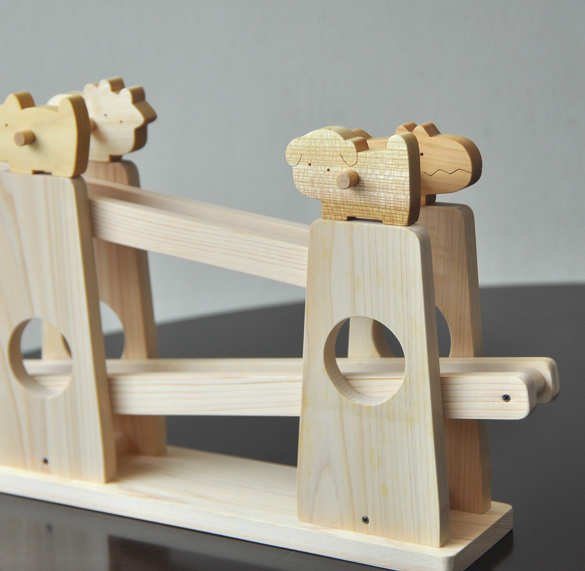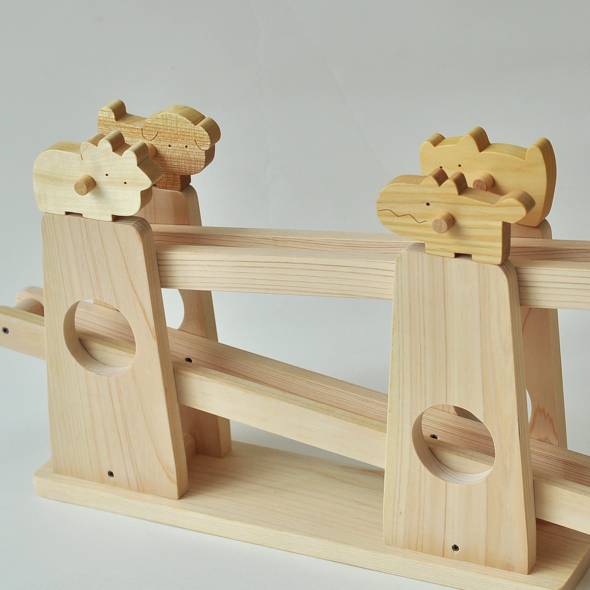 みんなでころりは、動物がくるくる回りながら転がり落ちてくる木のおもちゃです。上からゆっくりとコマが転がり、子どもたちはその動きを目で追いかけ、また同じ場所に置いて楽しみます。動きのあるおもちゃは子どもたちに大人気で、動物の置き方や転がし方を工夫することで、スムーズに転がることが嬉しい木のおもちゃです。