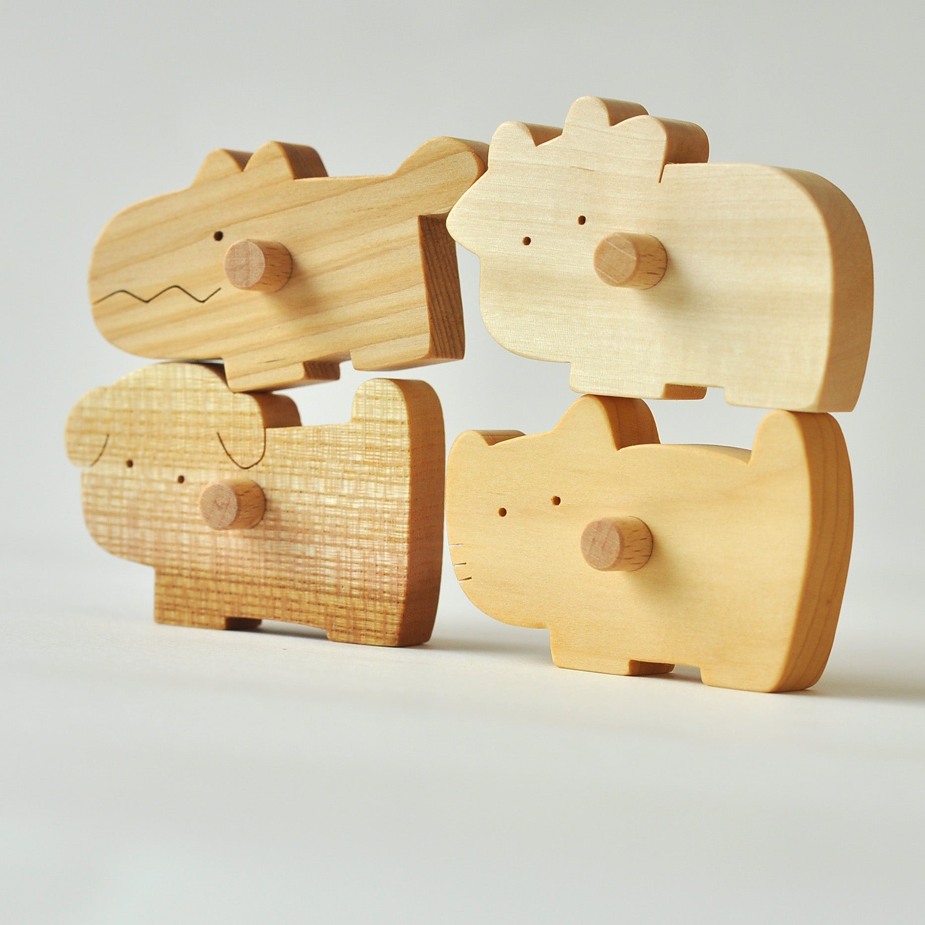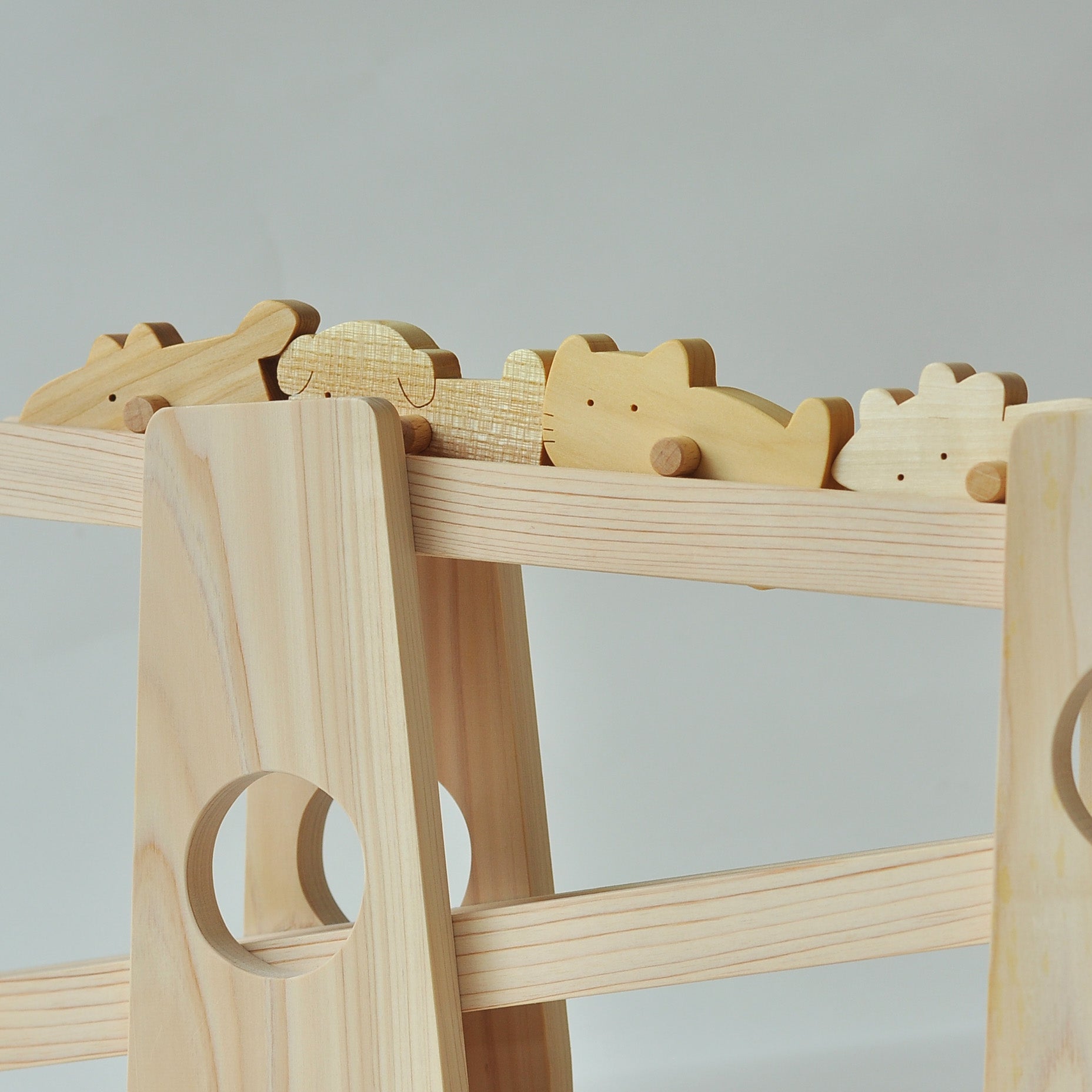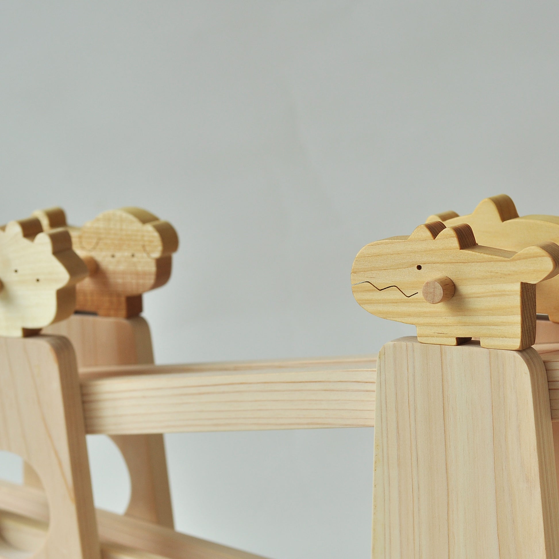 みんなでころりは、動物がくるくる回りながら転がり落ちてくる木のおもちゃです。上からゆっくりとコマが転がり、子どもたちはその動きを目で追いかけ、また同じ場所に置いて楽しみます。動きのあるおもちゃは子どもたちに大人気で、動物の置き方や転がし方を工夫することで、スムーズに転がることが嬉しい木のおもちゃです。